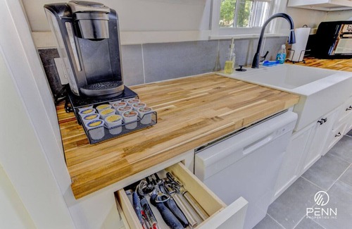 Mornings can begin on the covered front porch, where you’ll find seating under softly lit string lights, perfect for coffee or conversation. Inside, the inviting living room centers around a large smart TV and opens into a well equipped kitchen with a handy Keurig coffee station. With its unique blend of nostalgia and modern amenities, the layout feels both familiar and refreshing, a relaxing retreat for families, friends, or business travelers alike.
