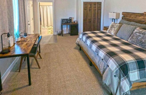 This king guest suite features a private bath, a mini fridge, a microwave, coffee maker. King bed and cute cabin decor! Our guest suites sit adjacent to the No Business Lodge, perched above the Payette River with beautiful valley views. Ample parking for your snowmobile trailer! Enjoy the peace and tranquility with a great location between Tamarack Resort and Brundage Mountain Resort, and just a short drive to Donnelly for a quick bite, or to McCall for some shopping and a hockey game.