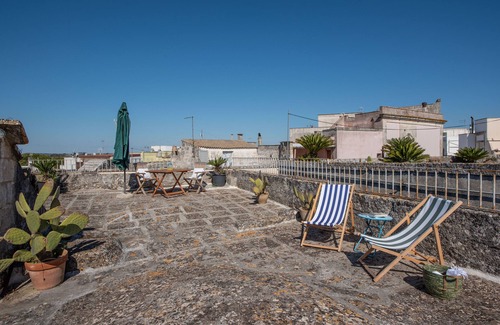 The real gem is the private terrace, perfect for sunbathing on the loungers or sipping a glass of wine at sunset, immersed in the warm colors of the Salento sky.