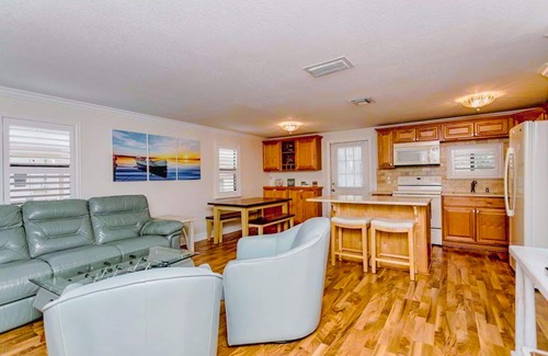 This is a single-floor home with two bedrooms and one bathroom. Both bedrooms are set up with queen beds, dressers, closets, and TVs. The kitchen, dining, and living room are all open-concept for entertainment. The bathroom has a tub/shower combination. The home has a washer/dryer but does not have a dishwasher. WiFi is provided throughout the house, but it does not have cable or streaming services.