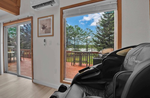 Inside, you’ll find an open-concept kitchen and living space with a large dining area and a cozy living room featuring a wood-burning fireplace. Step out onto the expansive balcony to grill or enjoy morning coffee with serene water views. A loft with lake views that has a desk for working and Xbox setup for the kids!