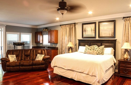 Enjoy dinner with a view each night at this sprawling vacation rental on Lake Murray. The covered patio and outdoor kitchen serve as your private gathering spot, with a gas grill, lounge area, and string lights for added ambiance. Spend a day out on the water before hosting a backyard barbecue or head inside to cool off in one of the living areas. With 4 full baths, 5 bedrooms - including a detached apartment - and endless space to entertain, this Gilbert getaway is a destination in itself!
