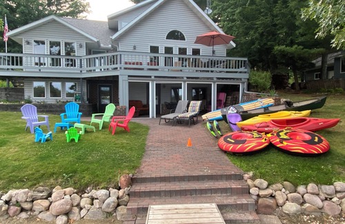 Our lake house has a large lakefront with a sandy beach and pier with a bench seat, great for fishing off for bluegill, crappie, bass, northern, and more. For your enjoyment and convenience, we have included many extra amenities, EVERYTHING needed to make our home, your home for your stay! Your rental includes: fresh bedding, pillows, towels, beach towels, 2 kayaks, 1 canoe, 1 paddle boat, a 6 x 18 foot floating Lilly pad, 8 x 10 ft Otter floating raft, 2 stand-up paddle board and life jackets of all sizes. There is a highchair, toddler bed, and 2 pack n plays available. There is a large outside upper and lower deck to relax, play games, and enjoy the lake view in the sun or shade, with lawn chairs and patio furniture.