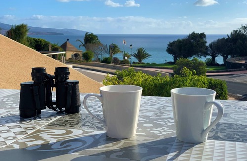 This Villa is located only a few walking minutes away from the white sandy beach in a well maintained complex. In the livingroom of about 50 m2 you will find a stereo installation, tv-set, kitchen and a generous eating corner. On the from the outside invisible Patio you find a private pool, teakwood chairs an table, sunchairs and a sunscreen. Through the Patio you reach the sleeping part of the Villa with 2 bedrooms (2 singel beds and 1 double bed) and a bathroom. The generous bathroom with daylight contains a shower, toilet and bidet. Through the Patio you reach as well the big sunningterass with fantastic seaview on the bay of Costa Calma. A good place for having a nice diner and to start or end the day in a comfortable way.