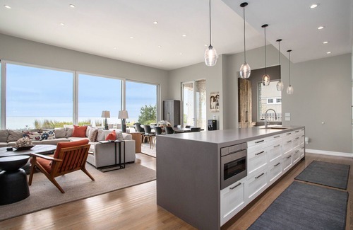 With spectacular views of Lake Michigan, this expansive waterfront home is perfect for your next family vacation or get-together with friends! The interior of this home is a showcase of its surroundings with a tasteful, modern aesthetic. Making the most of the property's premium location, this vacation rental provides a unique take on an open-concept plan with countless windows, abundant natural light, and sweeping views. The home offers a spacious floor plan. The well-equipped, full kitchen with a luxury oversized breakfast bar and wine fridge, living area, and dining area combined to provide the best entertainment experience. The living space features a wood-burning fireplace perfect for those chilly evenings, while the dining area is furnished with a beautiful wooden table.
