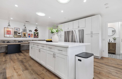 The kitchen is outfitted with upgraded new stainless steel appliances, new granite countertops, fully equipped with various gadgets such as food processor, blenders etc and plenty of dish-ware for large groups, all that and more will exceed all of your culinary expectations. The white and bright kitchen that is airy and spacious, with plenty of space for all your culinary aspirations will encourage you to stay in the kitchen.