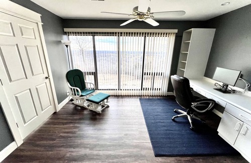 Located right off of Horseshoe Bend in Lake Ozark, MO, this home offers spacious accommodations for large families, or a group of adults up to 7+, where you can choose between a king bedroom, a queen bedroom, or a bedroom that can accommodate up to 6 on queen and twin bunk beds. There is also a home office where families can setup a crib or pack n play for small children or babies. If more is needed, there is a couch that pulls out into a queen bed with a plush memory foam mattress. All rooms are provided with storage and brand new smart LED televisions with full cable, wireless internet, and access to streaming services. The kitchen is stocked with all the tools you'll need to cook up your favorite meals, a full size fridge, electric range, microwave and coffee maker. There are 2 dining tables that can seat up to 10 and folding tray tables if more space is needed. The entire south wall of the home is windows open to stunning views overlooking the Lake of the Ozarks and it's rolling valleys. A charcoal grill is provided by the complex if you would like to grill up a delicious dinner! There is free parking right in front of the lodge only a few steps away.
