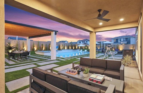 Brand NEW, stunning large villa in a beautiful gated neighborhood, surrounded by high end homes. One of the best and biggest backyards in the area due to the oversized lot. Minutes away from Fantasy Springs and Spotlight Casinos, The Golf Club at Terra Lago golf course, shopping and more. This corner lot home also offers great views, oversized yard with a large pool, plenty of shade, putting green plenty of outdoor & indoor games & game room. Minimum Rental age is 21 for the person booking.