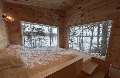 Cozy tiny house with a view on the river. Perfect getaway to relax and diconnect in the nature. 5 min. from all amenities. Queen bed in the window and double bed up the ladder, full bathroom, Wood stove and AC.