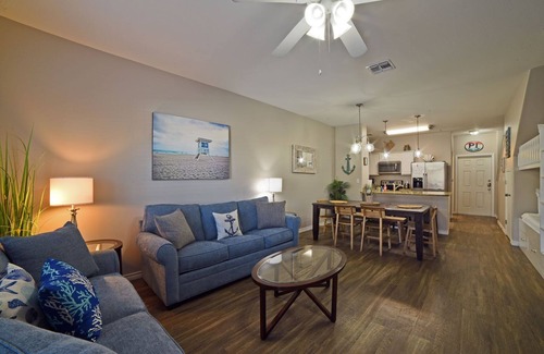 Relax on the patio and balcony of this family-friendly Corpus Christi townhouse, perfectly located only two blocks from the beach! Enjoy two resort-style community pools (a heated pool with a waterfall and a second children's pool), a kids' playground, and at-home amenities that include a full kitchen with granite countertops, multiple flatscreen TVs, an open floor plan, and beautiful floors throughout.