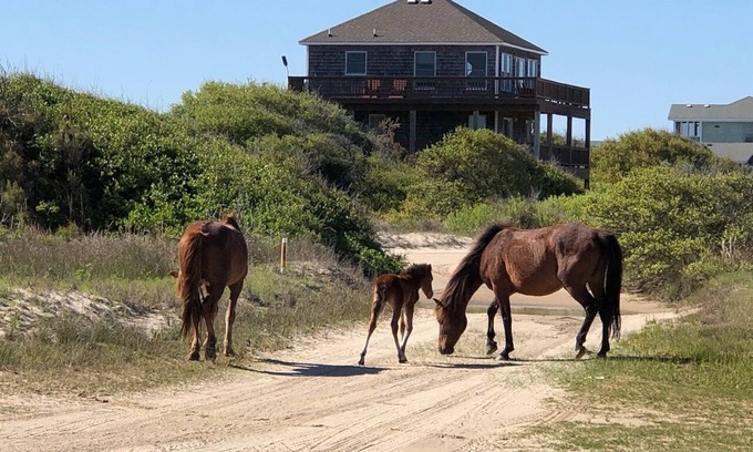 Four Wheel Drive Beach! This beach house with wrap around decks overlooks the Atlantic Ocean & Currituck sound. Spacious living room with cathedral ceiling and panoramic views. Watch wild horses in the front yard! Fish and swim in the ocean! Corolla's 4WD Breach is a different world! No traffic. See millions of stars without street lights to diminish the spectacle. Located three miles from the "paved road" the house is only accessible by four wheel drive. Fully equipped kitchen, central air & heat, linens, WIFI, TV in family room and each bedroom, BBQ charcoal grills. Three full baths plus private outdoor shower. Three bedrooms feature: king bed, queen bed and two full bunk beds. Some dogs ok with $200 deposit.