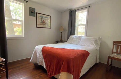 The cabin is well-equipped to accommodate up to 4 guests comfortably. The main bedroom features a queen bed and dresser, ensuring a restful night's sleep. In the living room, you'll find a full-size futon for additional sleeping space. The kitchen comes fully equipped with everything you need to prepare and serve meals for your party. It also includes a television and a window AC unit, ensuring your comfort on hot Wisconsin summer days. Outside, you'll have your own firepit and a charcoal grill, perfect for outdoor gatherings. Additionally, there is ample parking available for your truck with a trailer.