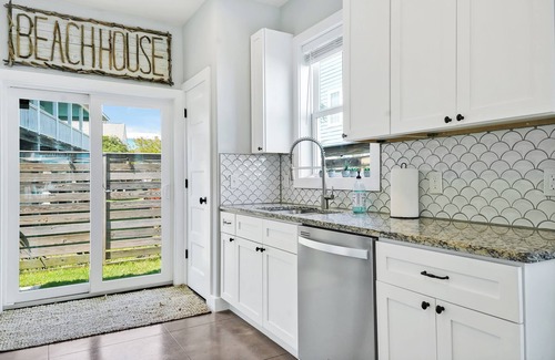 The first floor is where you will find the kitchen, dining area, living room, half bath, and master suite. Just outside the kitchen we have a gas grill and a fully enclosed outdoor shower.