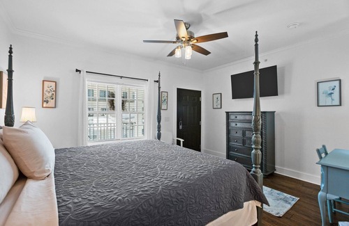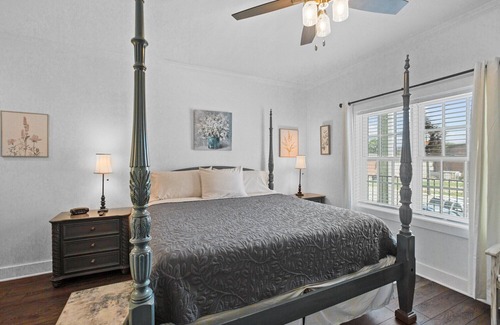 Step into a world of timeless elegance with the Tranter's Creek Room at Little Inn at Washington. The moment you enter, you're greeted by Southern charm in the form of a regal grey, vintage four-post king-size bed that promises a night of unparalleled comfort. Complementing this inviting centerpiece is a tasteful vintage dresser complete with a mirror, alongside a blue vintage desk that adds a pop of color to the room. As for the bathroom, it's a marriage of modern luxury and practicality, boasting an updated design and an LED anti-fog mirror for that perfect start to your day or evening.