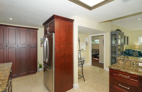 Next best thing to living on Siesta Key! Enjoy the convenience of living on the mainland with all the quick access to shopping and entertainment while being only 1 mile from World Famous Siesta Key. This updated, West of the Trail, coastal contemporary home is located in the sought after Granada neighborhood. Updates include Custom Kitchen w Devittori wood cabinets, granite counters, SS appliances and a breakfast bar. Metal roof, zoned A C's, Impact resistant Doors and PGT WinGuard windows, an RFG Remo-Halo proactive ionization system with UV, as well as LED lighting throughout the home. Hardwood and Travertine floors plus dual masters on opposite ends of the house, primary bedroom has closet system, vaulted ceiling, custom glass shower enclosure, dual sinks and a jetted soaking tub. All 3 bedrooms have direct access to the inviting backyard and two of the bedrooms have private patios. The lush backyard has a private outdoor shower and a hot tub Spa, brick pavers and composite decking.