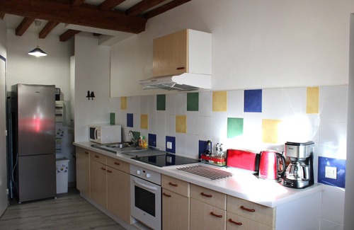 The kitchen is equipped with a refrigerator, as well as a coffee maker, a microwave, and cookware. Bathroom amenities include a hair dryer and towels. Other amenities include a BBQ grill, bed sheets, an ironing board, and heating.