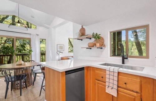 Take in the stunning view of Mt. Shasta in this spacious tiny home cabin, all while enjoying the sounds of the Upper Sacramento River. This newly remodeled one-of-a-kind experience is located on Cave Springs Resort. Kick off your shoes after a long day of adventuring, take a plunge in the private hot tub, and enjoy meals on the deck while absorbing the sounds and views of nature.