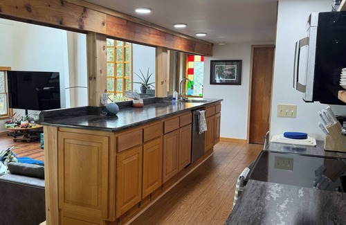 Enjoy Lake Champlain from this gorgeous two-bedroom home in Upstate NY. This partial A-Frame offers tons of sunlight in the main living areas and a cozy, relaxing atmosphere. If you’re a fan of plants, local art, and nature, you’ll love it here! With a king bed in the main bedroom, 1 queen bed and a bunk bed in the second bedroom, and loads of Yogibo beanbags, there’s enough room for everyone. Two couches in the living area transform into comfortable queen-size sleeping, allowing for a maximum occupancy of 10 people. If you like extra amenities, the home sports a well-equipped kitchen, a bidet on the main floor bathroom, jetted tub upstairs, outdoor fire pit, and a propane grill. Spend your time paddling on a kayak or canoe, taking trip to nearby Vermont or Montreal, exploring local hiking options, or just relaxing by the water!