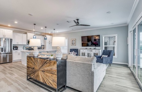 Beds: Main - King, Guest Upstairs- King, Guest Upstairs - Queen, Guest Downstairs - Queen Modern, Fully Equipped Kitchen with Quartz Countertops and Center Island, Stainless Appliances Regular & Keurig Coffeemaker Main Bath: Large walk-in shower, double vanities, separate water closet, rainfall shower head Guest Baths Upstairs: Tiled walk-in showers Guest Bath Downstairs: Tub/shower, single vanity In Unit Washer and Dryer Wood-look Ceramic Tile throughout Living Dining, Kitchen, Foyer Carpeted Bedrooms Ceiling fans in every room Electronics include 70 in Smart TV in Living Room, 55 in Smart TV in Main, 50 in Smart TV in Upstairs King Guest, 40 in Smart TV in Upstairs Queen Guest, 40 in Smart TV in Downstairs Queen Guest Screened Lanai **We do not recommend Golf Carts due to the strict golf cart policy stating only 2 people per golf cart at a time