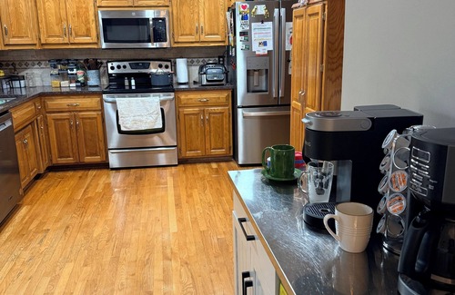 Kansas City is waiting for you at this 4-bedroom house. Step into this charming and peaceful retreat with 2 queen beds, 2 full beds, and 1 twin bed. Relax in the tranquil jetted bathtub or unwind in the cozy living room with an additional full bed. AC, heating, and other essentials are provided for your comfort. 1/3 of an acre with a full privacy fence, a deck and a patio with a smoker and a grill. Full kitchen with a pantry and all the necessary essentials. Two full refrigerators and one small bedroom refrigerator. Two car garage with four additional parking spaces in the driveway.We hope you enjoy what our place and Kansas City has to offer.