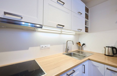 The apartment boasts a well-appointed kitchenette that includes an oven, four ceramic glass hob hotplates, and a freezer, allowing you to prepare meals with ease during your vacation. The bathroom is equipped with a shower and a toilet for your convenience. The apartment is designed with electric heating and underfloor heating to ensure a cozy and comfortable environment throughout your stay. Wi-Fi internet access is also provided, ensuring you stay connected during your vacation.