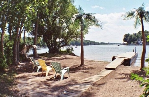 The front of the cottage sits on the beach with Lake Ontario rolling in the waves. There is a deck with a bar and stools for enjoying a cocktail at sunset or something to eat during the day. Between the deck and the Lake is a raised sandy beach for playing in the sand or getting some sun. Large boulders protect this beach from the waves if the lake gets rough. Plenty of body surfing and swimming in the Lake. The Lake has a sandy bottom and there are no drop offs so its great for you and the kids. The back of this wonderful cottage sits on Sodus Bay with a raised sandy beach and two palm trees . There is a 16 x 24' deck with an outdoor kitchen 10 x 6' which includes a Weber gas grill. There is a fire pit and picnic table. The entire yard is beach sand. The water is calm and great for swimming and fishing, water-skiing, and all kinds of water sports. There is a floating dock and great fishing from the dock.