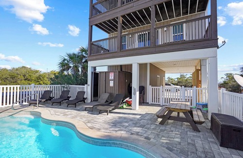 Step outside to discover your private resort area, built for fun and convenience. Private Pool Deck: An expansive and comfortable deck surrounds the private pool, which may be heated (fees apply). Family-Friendly Extras: Outside, you'll find a hot/cold outdoor shower, both a BBQ charcoal & gas grill, pool chairs, and a picnic table. Convenience: The first-floor entry includes a separate laundry room with an extra full-size refrigerator—perfect for keeping pool drinks and snacks cold! Parking & Gear: Enjoy ample parking that can accommodate several large vehicles, a boat with a power hookup. We provide a variety of beach chairs, an umbrella and beach toys. Kid Amenities: We make traveling easy with a booster seat, Pack and Play, baby gates, and a child's step stool provided.