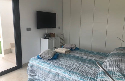 Luxury 3 bedroom villa which sleeps up to 6 guests. The master bedroom has its own en-suite (great views to the pool). A further 2 bedrooms which both have 2 single beds. The kitchen is open plan design with fridge/freezer, hob, oven, microwave and dishwasher. You will find the utility room (washing machine) located on our spacious rooftop solarium. The villa is fully air conditioned with fantastic outdoor spaces with pool and BBQ. Free WIFI and an Amazon Alexa for your music!