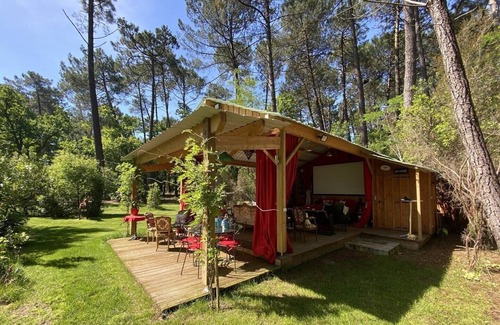 A cinema area offers a large screen with an overhead projector, independent WC and a boudoir. A 140 cm double bed is at your disposal in this space open to nature.