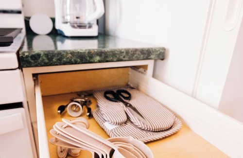 Off the living room is a fully equipped kitchen featuring modern large appliances as well as multiple small appliances, and all the cookware you need to whip up your favorite dishes, along with plenty of counter space. A dining room table that seats up to 4 is the perfect place to gather for a meal.