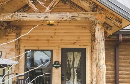 BEDROOM 1: Sleep soundly in a premium queen-size bed nestled between a unique log base and rugged log headboard, all underneath a ceiling with roughhewn beams supported by walls made of split log planking. The large windows on two walls allow plenty of light in the daytime with privacy shades for the night. Your sleeping alcove is adjoined by a rustic bathroom featuring an all-wood counter with a farmhouse sink and a walk-in glass shower big enough for two. A hairdryer and essential amenities are provided to help you start your day or prepare for the evening out.
