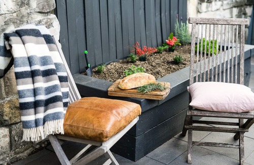 Outdoor terrace with BBQ, rain tank and relaxed seating area