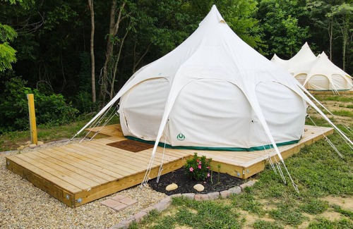 Relax and reconnect around the crackling fire, and wake up to the singing birds of the Smoky Mountain National Park area. The luxury camping experience offers guests a 16 foot bell tent with wood floors, memory foam mattress, and air conditioning for a cool and comfortable sleep.
