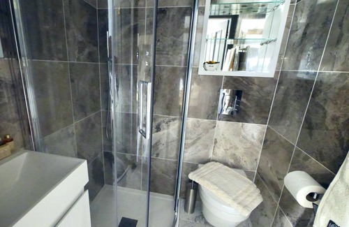 Upstairs, the main double bedroom at the front of the cottage has views towards Claife Heights in the distance. A standard size double bed is provided. The bedroom has reproduction French-style period furniture and an en-suite shower room. This bedroom has a bright and airy feel to it which is complemented by the exposed beam and period furnishings. The second bedroom has a single bed and also has an en-suite shower room. Both bedrooms have wall-mounted Samsung TVs. All bedlinen is included.