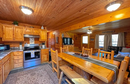 Upon arrival, guests will notice the screened in front porch which is a great space for sipping morning coffee or enjoy outside time during a spring storm. Guests will walk into the Wilderness Lodge to a beautiful, open concept living room and fully equipped kitchen. The 5 bedrooms offer a place for our customers to “hit the hay” after a day of exploring all the nearby state parks.