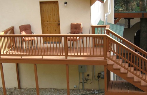 The second story guest suite includes a private guest bedroom with a queen sized bed, and features a full bathroom with shower and tub. A spacious upstairs great room features a cozy living room area with a futon couch, flat screen remote TV, two King size beds, and a cozy deck out back. Enjoy breath taking mountain views while relaxing in the the plush southwest pueblo design during your stay.