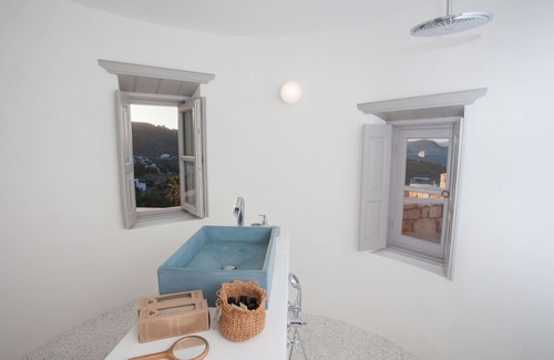 On the upper ground floor, the residence’s main section, the lounge room and bedroom share a spacious, common area. Nearby, there is a unique, spacious, circular bathroom with a panoramic view. The residence has a direct view and access to the large balcony that extends to the front and overlooks the sea. The residence’s outdoor kitchen, along with the adjacent dining area and lounge area, which are situated in the inner courtyard (secured by a stone wall) are of particular interest.
