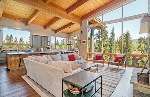 Walk through the door and it's like stepping into a modern mountain treehouse—wrapped in windows, drenched in natural light, and surrounded by stunning alpine views. With a creek flowing just below, nature feels close enough to touch. The great room is made for cozy evenings, with comfy seating around a wood-burning fireplace. Just steps away, the open-concept chef's kitchen makes it easy to cook, gather, and soak up the view—all at once.