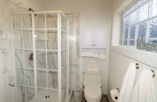 Three full bathrooms - two with French style showers and one with a shower/tub and even a stain-glass window! Master bath has a double sink vanity. Blow dryers, towel sets, hand and shower soap, and toilet paper