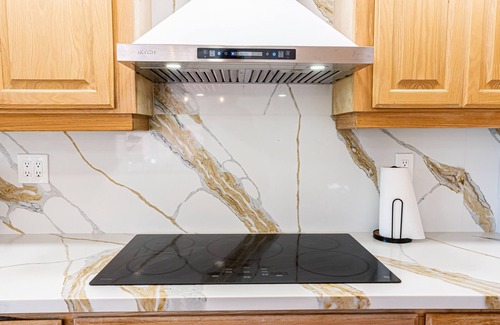 Fully equipped kitchen has double wall oven, induction cooktop, French door refrigerator, wine cooler, instant pot, air fryer, food processor, coffee maker