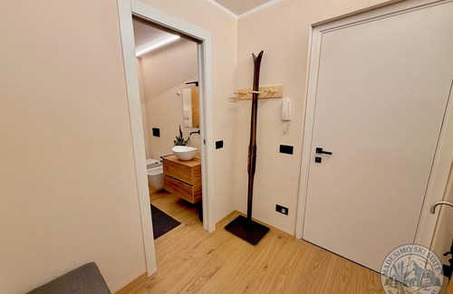 The entrance is spacious and designed for mountain lovers, with wardrobes and dedicated spaces for skis, snowboards, and boots, keeping everything tidy and dry after the slopes.