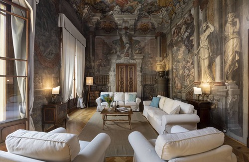 Live in the heart of Florence as the Florentines do in this beautifully-renovated, frescoed apartment with soaring ceilings, exquisite furniture and paintings and a modern kitchen. Arrange for a sumptuous meal or a wine tasting in the gracious dining-living room, soak in the large porcelain tub, enjoy an “aperitivo” on the terrace or in the sitting room, read or work at the sitting area in each bedroom.