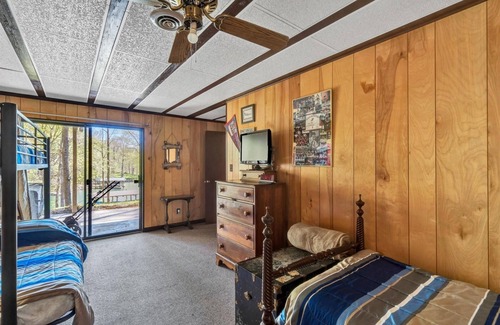 The master is on the main level with an en-suite bath and sitting room adjacent. The second bedroom is also on the main level, with a Queen bed and bath in the hall. Downstairs, the bunkroom has a pyramid bunk and 2 twins for the kiddos to group together.