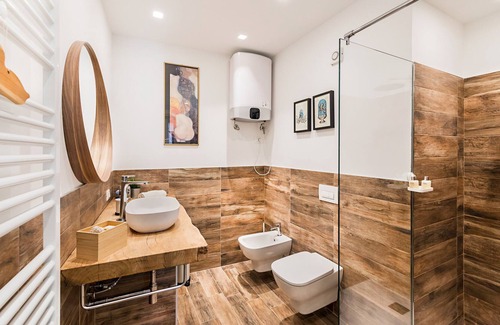 The one-bedroom apartment welcomes guests with a bright living room equipped with a double sofa bed, flat-screen TV, dining table with chairs and fully-equipped kitchen with small electric stove, microwave, electric kettle, juicer, coffee maker and toaster. The apartment continues with the bedroom complete with queen-size bed, closet, and bathroom with shower. The room overlooks the living room through a small window. The studio apartment (with separate access) consists of a large living room which benefits from a second kitchen and equipped with an additional double sofa bed, and the second bathroom with shower. Wi-Fi and air conditioning in all rooms are available to guests.