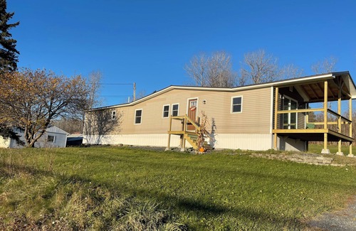 Stay comfortably in Frenchville at this completely renovated 2-bedroom mobile home. The cozy space features an open concept living area with a fully equipped kitchen. Enjoy the newly built porch just off the kitchen area for all your outdoor grilling. (Grill and propane provided.) Our porch is the perfect spot for beautiful views and sunsets over the Beautiful Saint John River! The Home features 1 queen bed, 1 bunk bed, and 1 futon, perfect for a small group of guests. With amenities like a washing machine, Dryer, indoor electric fireplace to set the mood! You'll have everything you need for a lovely stay. The bathroom comes equipped with a hair dryer and bath towels. It's easy to see why you'll be able to unwind at our place.