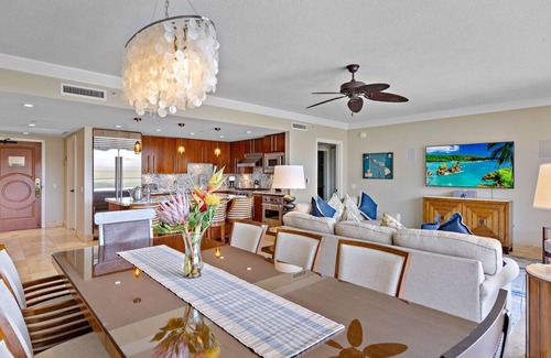 Directly next door, Hokulani 404 is a luxurious 3BR/3BA oceanview suite featuring not only incredible ocean views from its highly sought-after 4th-floor floor plan nestled just one column back from oceanfront, but gorgeous views of the lush Wes Maui Mountains as well.