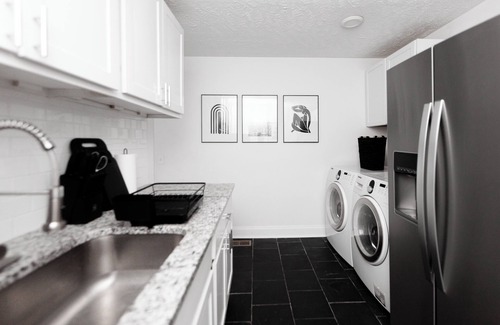 Enjoy sleek black-and-white interiors with curated art and quirky details. Walk to local restaurants or take a short drive to downtown for music and attractions. Book your mid-term stay today!