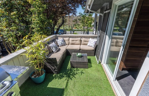 This 1949 space, a nod to mid-century tropical glamour, blends vintage, upcycled, and modern touches. It sleeps 6: king bedroom (2), twin bedroom (2), queen sofa bed (2). Enjoy a renovated kitchen, bathroom, in-suite laundry, and Horner Park views. Your private patio has a grill and courtyard access. Includes free parking for one car, close to transit, shops, restaurants, UVIC, Camosun, Cadboro Bay Beach (6 min drive), and downtown Victoria (15 min drive).