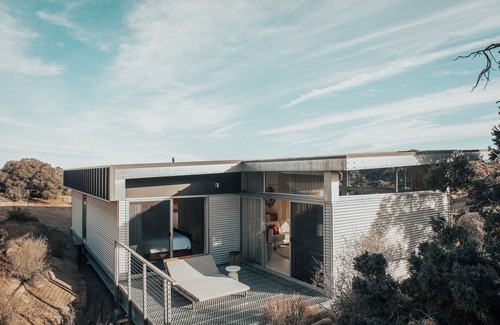 The Graham Residence - profiled in Dwell Magazine and featured by Hunker Home, The Perfect Hideaway, and Airbnb, sits in the boulders of Rock Reach on 10 acres in total privacy. The house is surrounded by boulders, ancient junipers, stunted desert oaks and resilient piñon pines. It is a hi-desert wonderland. Most of the landscape is untouched and every bit as unique as nearby Joshua Tree National Park itself.