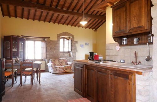 "Mimosa - Borgo la Civitella", 1-room apartment 43 m2 on 1st floor. Rustic furnishings: living/sleeping room with 1 french bed (160 cm), dining table, TV and wood-burning stove. Open kitchen (mini-oven, Gas stove, 4 gas rings, kettle, electric coffee machine). Shower/WC. Gas heating. Natural stone floors. Terrace furniture, sitting area. Panoramic view. Facilities: baby cot. Internet (WiFi, free). Please note: non-smokers only. Private entrance.